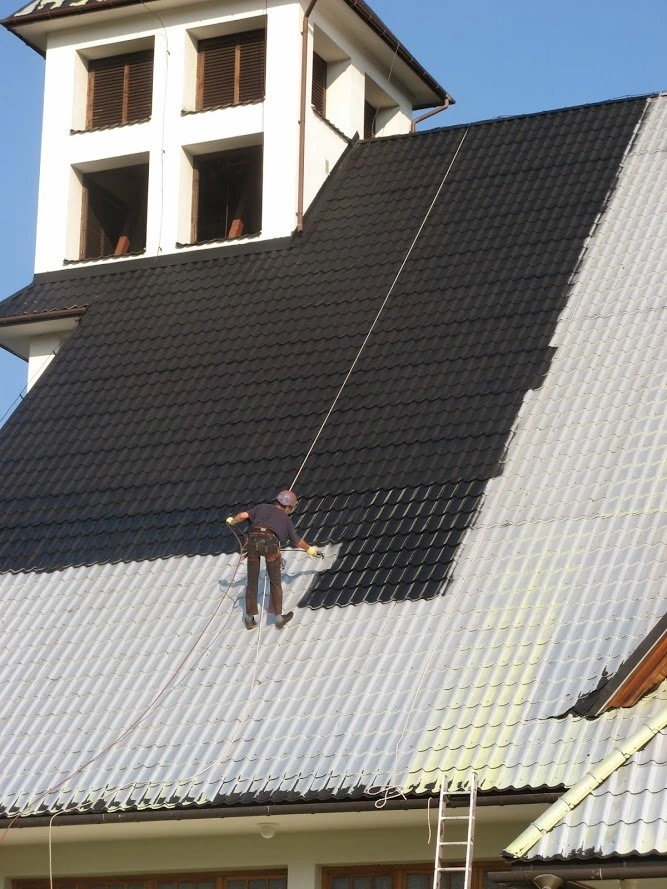Po zakończeniu mycia dachu – niezwykle czasochłonnym etapie – przystąpiliśmy do odtłuszczenia pokrycia i jego malowania. Podjęcie się tej realizacji wiązało się z pewnym ryzykiem: skoro oryginalna farba łuszczyła się z nieznanych przyczyn, obawy o trwałość nowej powłoki były uzasadnione, nawet przy pełnym zachowaniu procedur technologicznych.